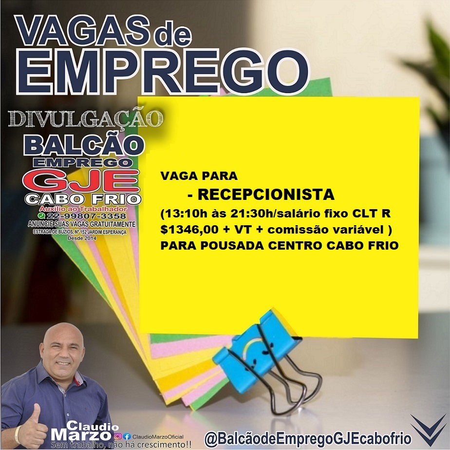 VAGA PARA RECEPCIONISTA (13:10h às 21:30h/salário fixo CLT R$1346,00 + VT + comissão variável ) PARA POUSADA CENTRO CABO FRIO